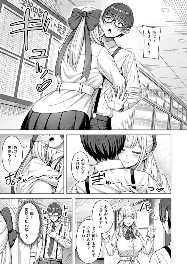 しかし鈴本くんからすれば、いきなりお嬢様に抱きつかれて、しかも胸には彼女の大きなおっぱいの感触が残っていて、その後の授業に集中できるはずがありません。